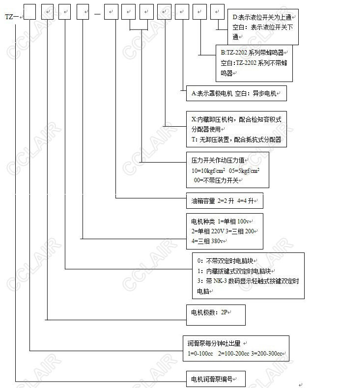 TZ-2232-410X 表示為單相220v配有NK-3型數(shù)顯微電腦、10kgf/cm2壓力開關、內藏卸壓機構,4升油箱的TZ型潤滑泵。