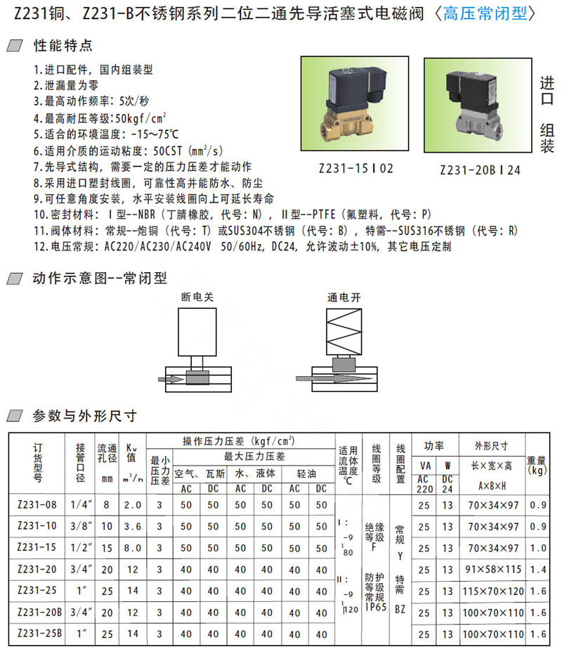 詳細信息 Z231-08,Z231-10,Z231-15,Z231-20,Z231-25,Z231-20B,Z231-25B,活塞式高壓電磁閥