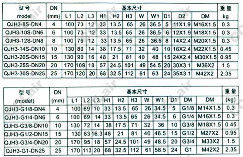 QJH3-G1/8-DN4,QJH3-G1/4-DN6,QJH3-G3/8-DN10,QJH3-G1/2-DN15,QJH3-G3/4-DN20,