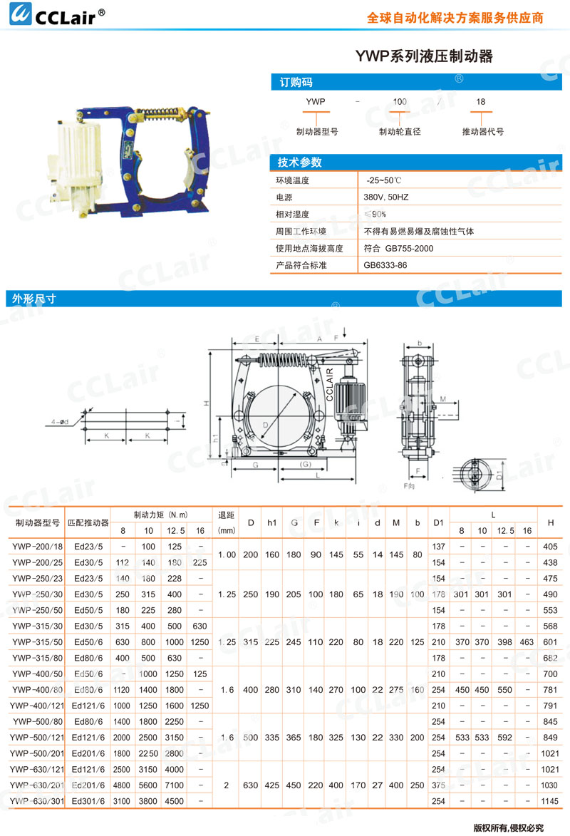 YWP-200,YWP-250,YWP-315,YWP-400,YWP-500,YWP-630,YWP-630/201,YWP-250/50,液壓制動(dòng)器