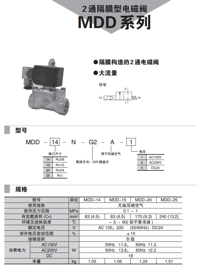 MDD-14-N-G2-A-1,MDD-15-N-G2-A-1,MDD-20-N-G2-A-1,MDD-25-N-G2-A-1,2通隔膜型電磁閥