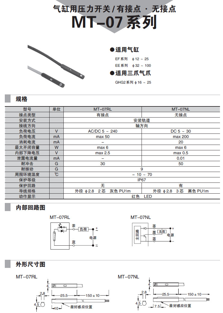 詳細(xì)信息 MT-07RL,MT-07NL,氣缸用壓力開(kāi)關(guān)