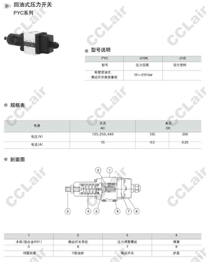 詳細(xì)信息 PYC-210K-21B,回油式壓力開(kāi)關(guān),無(wú)錫昌林