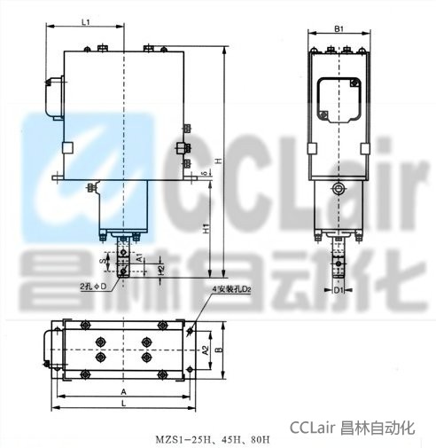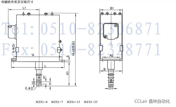 三相交流長(zhǎng)行程制動(dòng)電磁鐵,其外殼除MZS1-80H外都用鋼板焊接而成。且MZS1-25H、45H及80H三種又具有緩沖裝置。