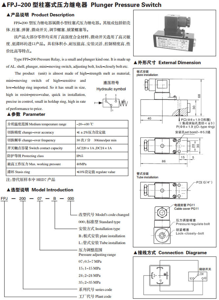 產(chǎn)品: 瀏覽次數(shù):669FPJ-200,柱塞式壓力繼電器