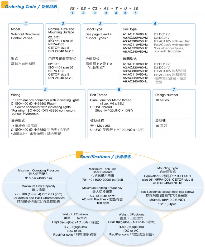 VS-03-C2-A1-T-U-10,VS-03-C2-A2-T-U-10,VS-03-C2-A3-T-U-10,VS-03-C2-A4-T-U-10,HYDROMAX電磁方向控制閥