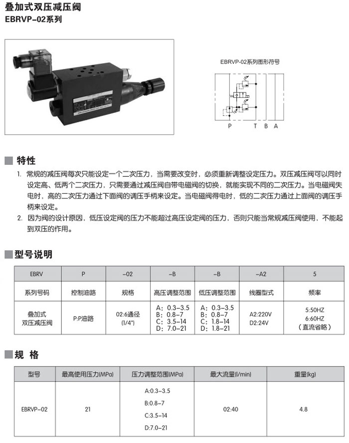 EBRVP-02-A,EBRVP-02-B,EBRVP-02-C,EBRVP-02-D,EBRVP-02-A-A-A2,EBRVP-02-D-D-D2,疊加式雙壓減壓閥