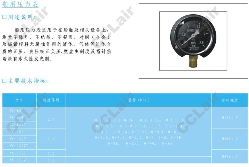 詳細信息 YC-60,YC-60T,YC-60ZT,YC-100,YC-100T,YC-100ZT,YC-150T,YC-150ZT,船用壓力表,CCLair