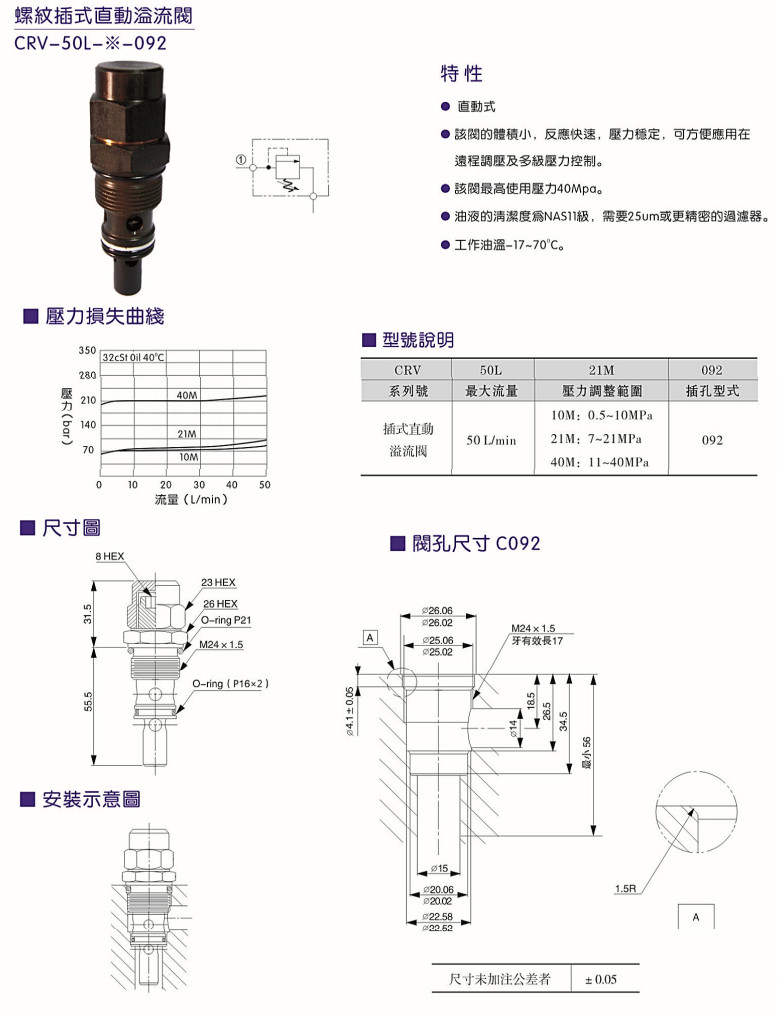 CRV-50L-10M-092,CRV-50L-21M-092,CRV-50L-40M-092,螺紋插式直動溢流閥