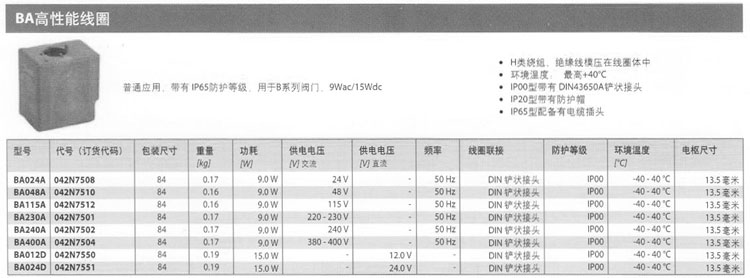 詳細(xì)信息 BA024A,BA048A,BA115A,BA230A,BA240A,BA400A,BA012D,BA024D,電磁閥線圈
