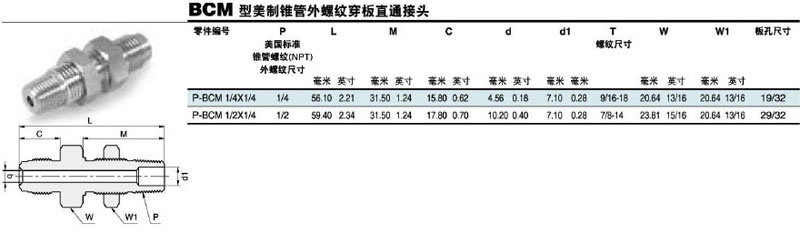 P-BCM-1/4*1/4,P-BCM-1/2*1/4,錐管外螺紋穿板直通接頭