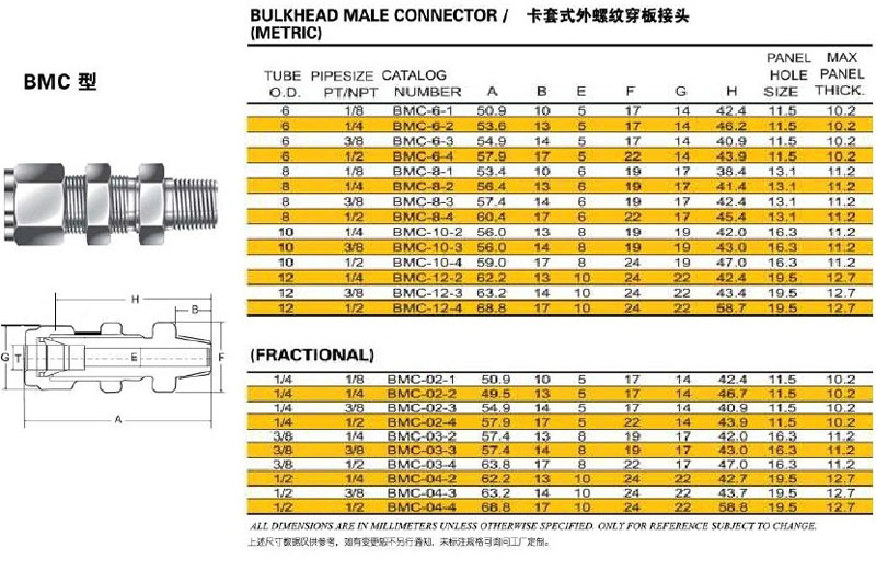 詳細信息 BMC-6-1,BMC-8-4,BMC-10-2,BMC-12-2,BMC-02-4,BMC-03-2,卡套式外螺紋穿板接頭