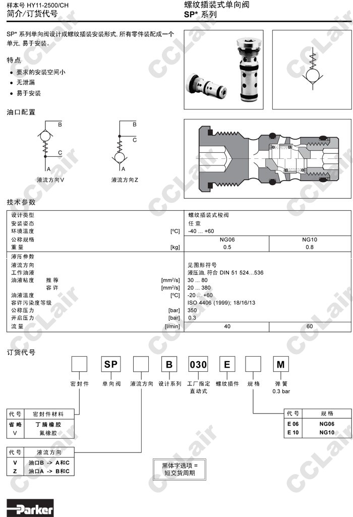 SPVB030EE06M,SPVB030EE10M,SPZB030EE06M,SPZB030EE10M,Parker螺紋插裝式單向閥