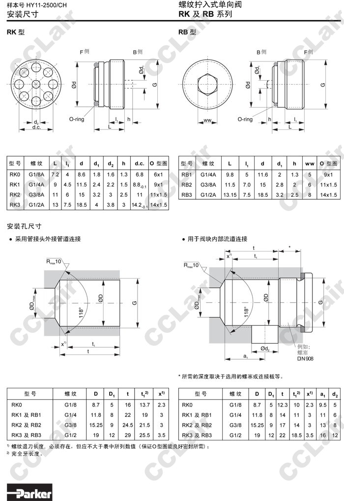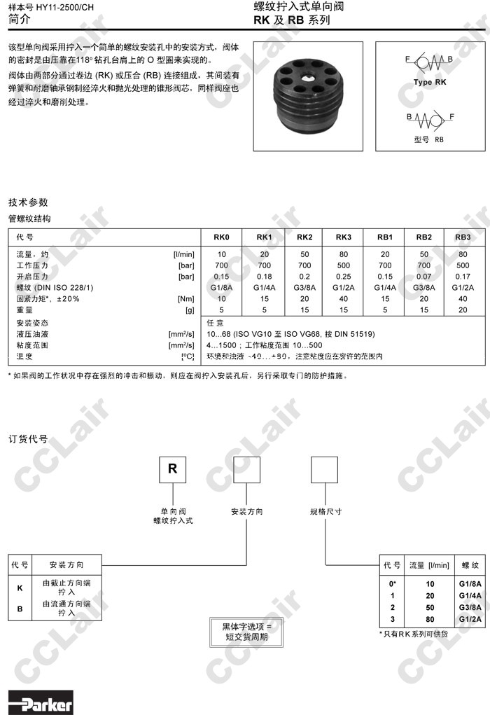 RK0,RK1,RK2,RK3,RB1,RB2,RB3,Parker螺紋擰入式單向閥