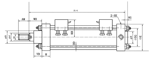 一、特點: 采用磁性活塞與CK系列磁感應(yīng)發(fā)訊器組合應(yīng)用新技術(shù),實現(xiàn)氣缸往復(fù)自動換向。環(huán)境溫度-20~+60℃(在不凍結(jié)條件下)。 安裝尺寸及安裝形式與QGBⅡ氣缸相同。 二 、圖形符號: ![]() 三、型號說明: ![]() 四、外形及安裝尺寸: