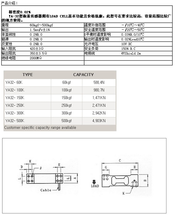 詳細信息 YA32-60K,YA32-100K,YA32-150K,YA32-250K,YA32-300K,YA32-500K,setech稱重傳感器