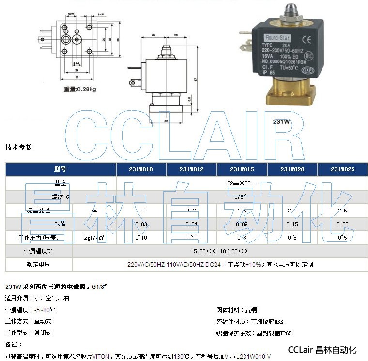 231W010,231W012,231W015,231W020,231W025,兩位三通的電磁閥,G1/8〞