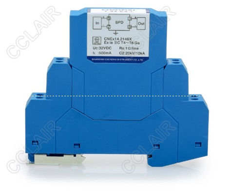 5V信號(hào)SPD,四線制,本安型,適用于線對(duì)地隔離電壓>500V信號(hào)回路,最大放電電流Imax(8/20us):20kA/線,12.5mm超薄,通過DIN35金屬導(dǎo)軌接地。