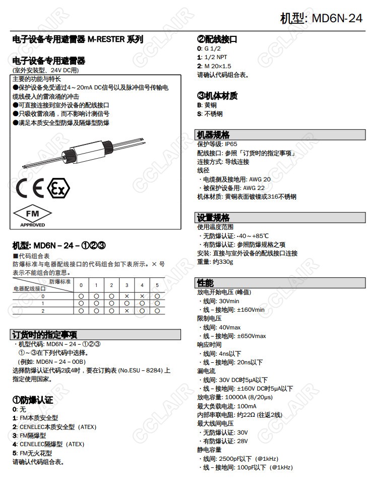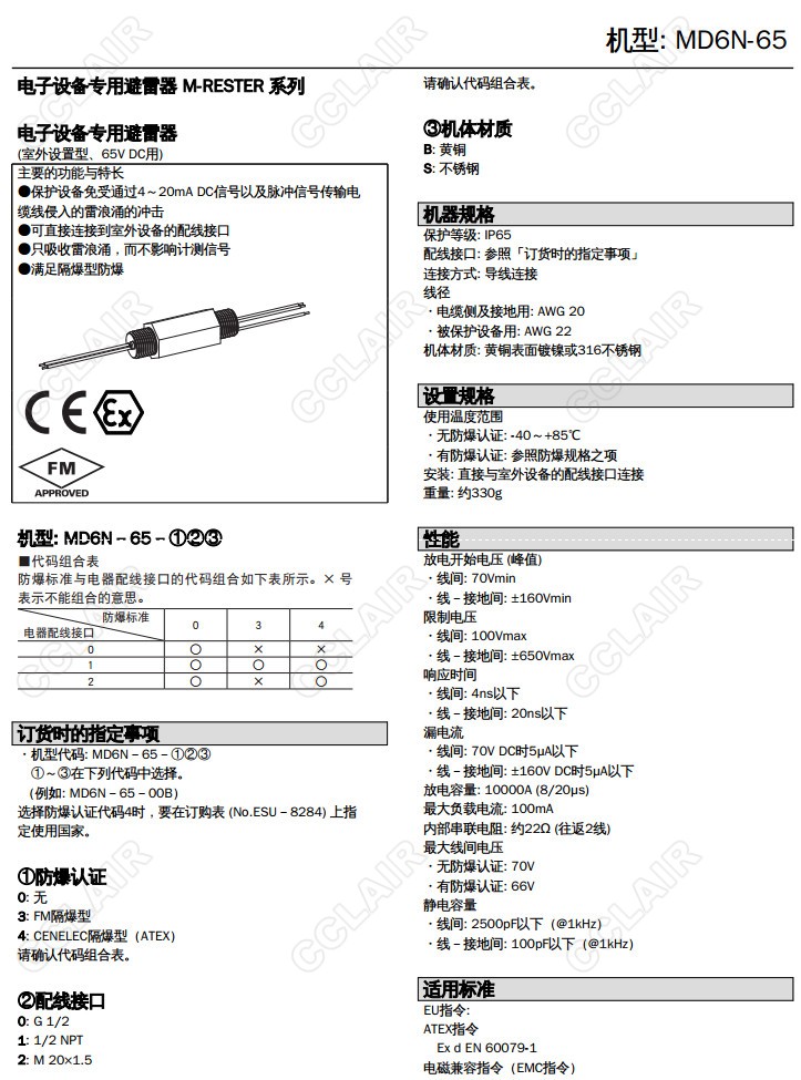MD6N-24/MD6N-65,MD6N-24-00B,4-20mA直流、脈沖信號(hào)用 室外安裝型 引線連接型 突頭型,避雷器