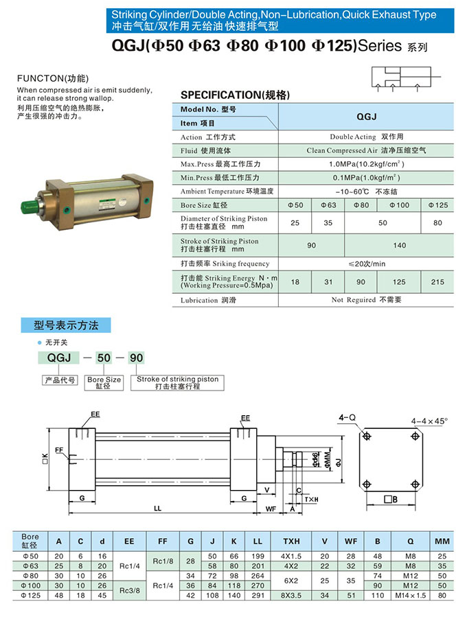 QGJ-50-90,QGJ-63-90,QGJ-80-140,QGJ-100-140,QGJ-125-140,沖擊氣缸