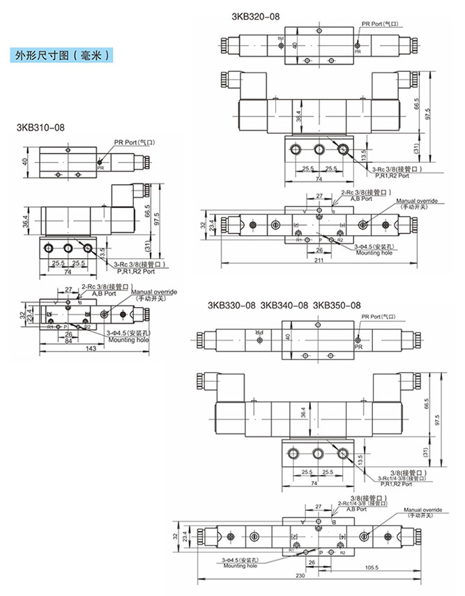 3KB310-08,3KB320-08,3KB330-08,3KB340-08,3KB350-08,3KB310-08-B,先導(dǎo)式五通電磁閥