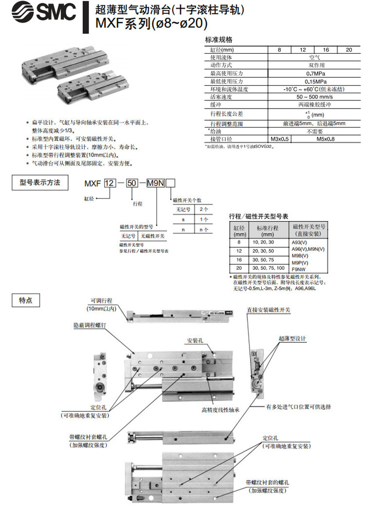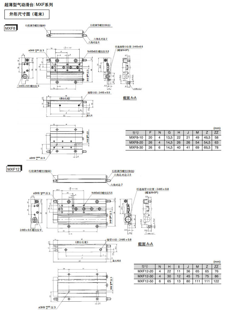 MXF8-10,MXF12-20,MXF16-30,MXF20-30,MXF8-20,MXF12-30,MXF16-50,MXF20-50,SMC超薄型氣動滑臺氣缸