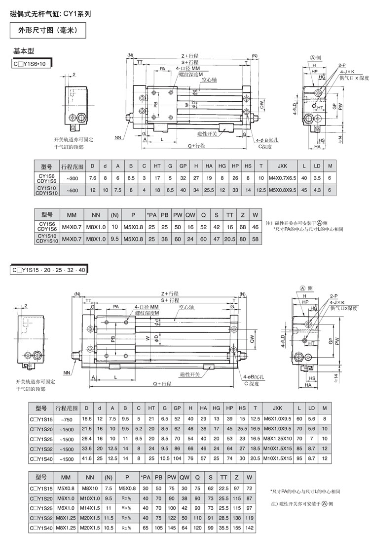 CY1S6,CY1S10,CY1S15,CY1S20,CY1S25,CDY1S6,CDY1S10,CDY1S15,CDY1S20,CDY1S25,SMC磁偶式無桿氣缸