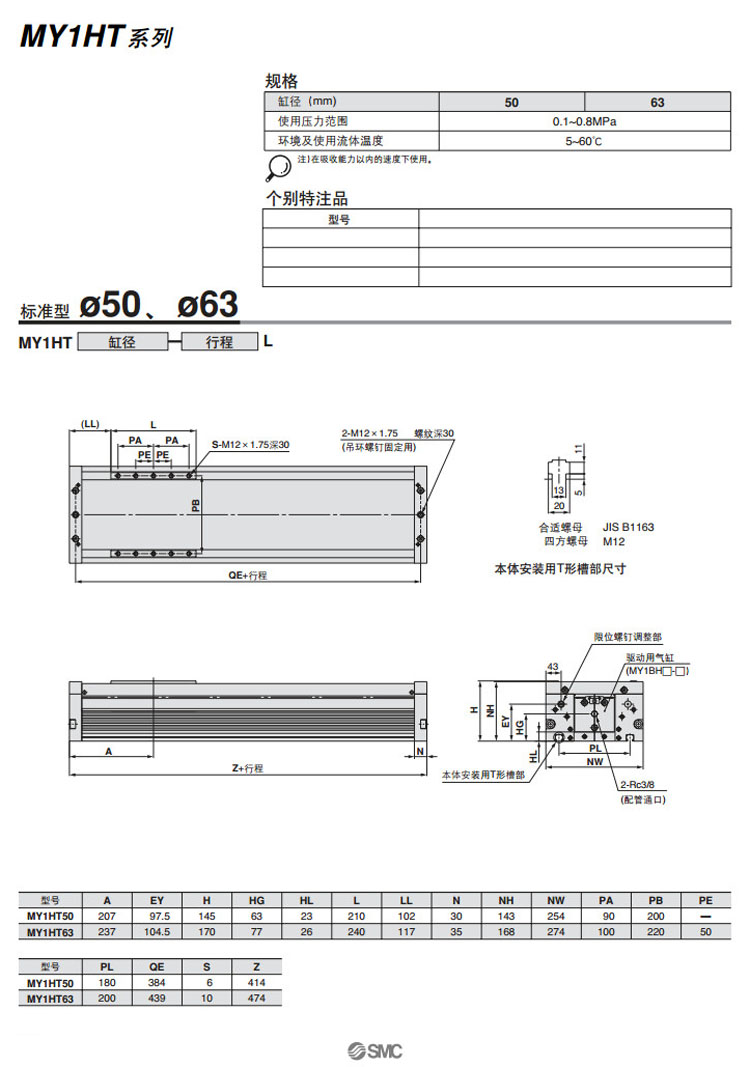 MY1HT50,MY1HT63,SMC無桿氣缸