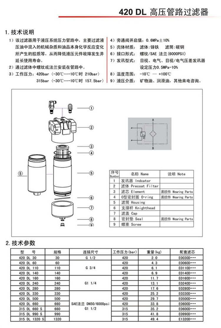 420DL330,420DL500,420DL660,315DL660S,315DL990S,315DL1320S,420DL330KN3,420DL660KN20,單筒高壓管路過濾器 |