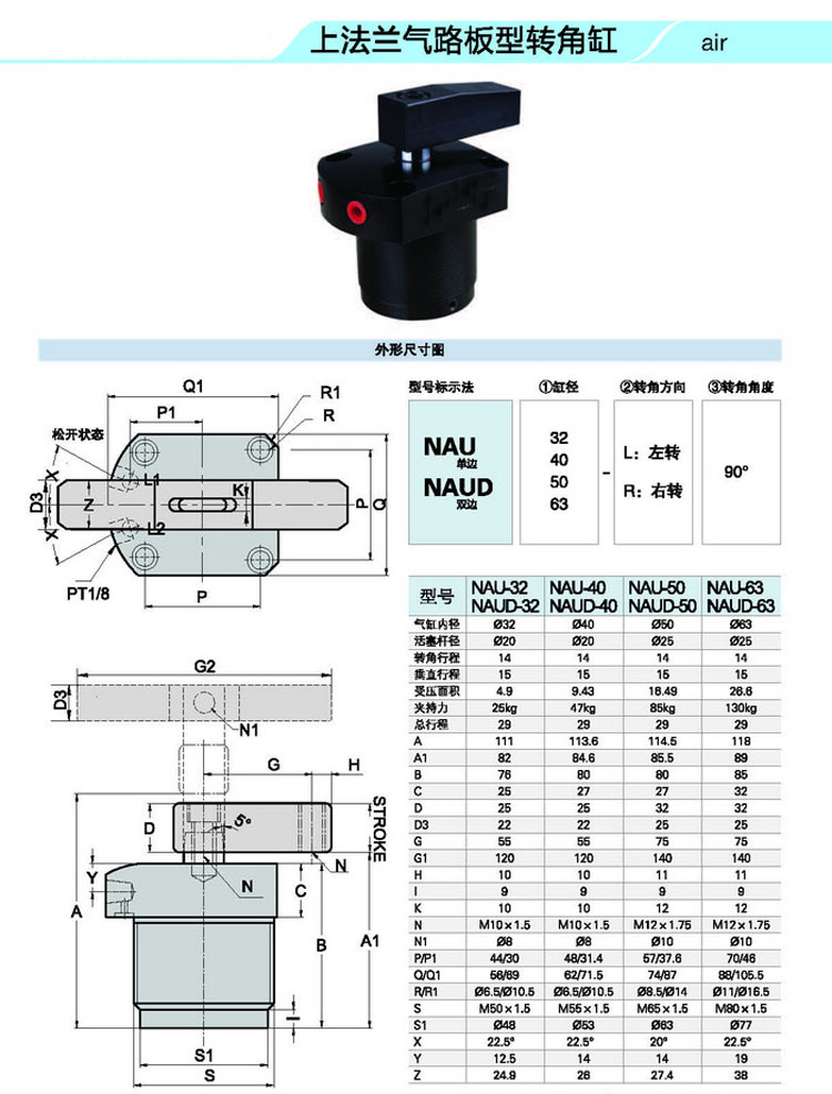 NAU32,NAU40,NAU50,NAU63,NAUD32,NAUD40,NAUD50,NAUD63,NAU32-L90,NAUD32-R90,空壓轉(zhuǎn)角缸