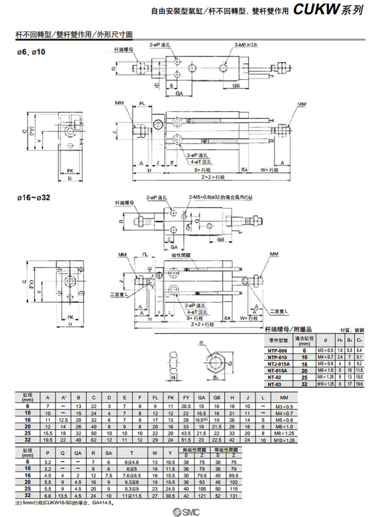 CUKW6,CUKW10,CUKW16,CUKW20,CUKW25,CUKW32,CDUKW6,CDUKW10,CDUKW16,CDUKW20,CDUKW25,CDUKW32,SMC自由安裝型氣缸
