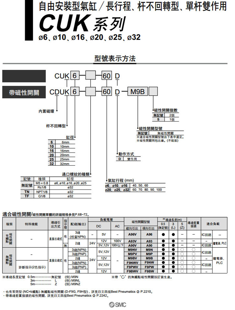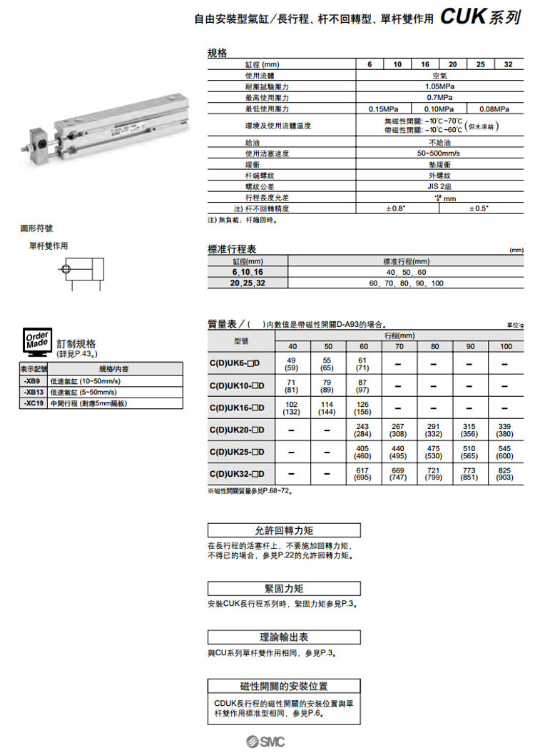 CUK6,CUK10,CUK16,CUK20,CUK25,CUK32,CDUK6,CDUK10,CDUK16,CDUK20,CDUK25,CDUK32,CUK6-40D,SMC自由安裝型氣缸