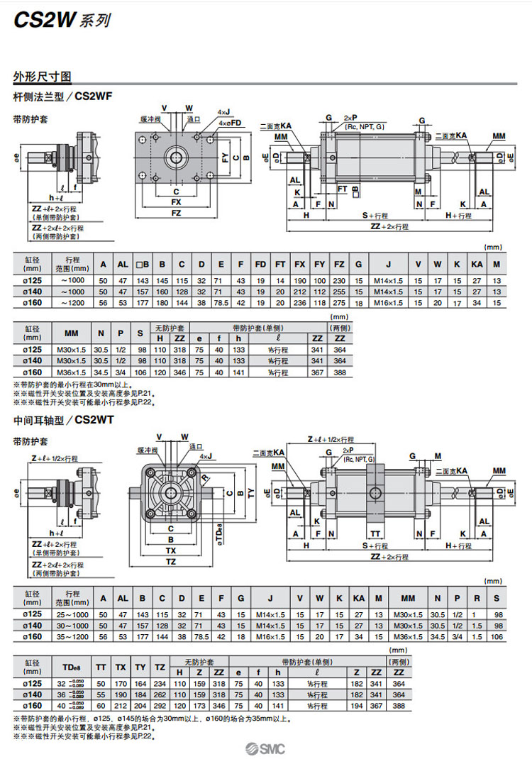 CS2WB125,CS2WL125,CS2WF125,CS2WT125,CDS2WB125,CDS2WL125,CDS2WF125,CDS2WT125,SMC雙桿型氣缸