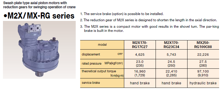 M2X170-RG17C27,M2X170-RG23C34,MX250-RG100C88,Kawasaki起重機回轉(zhuǎn)用帶減速機斜盤式軸向柱塞馬達 |