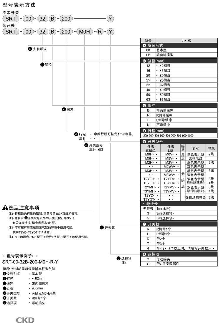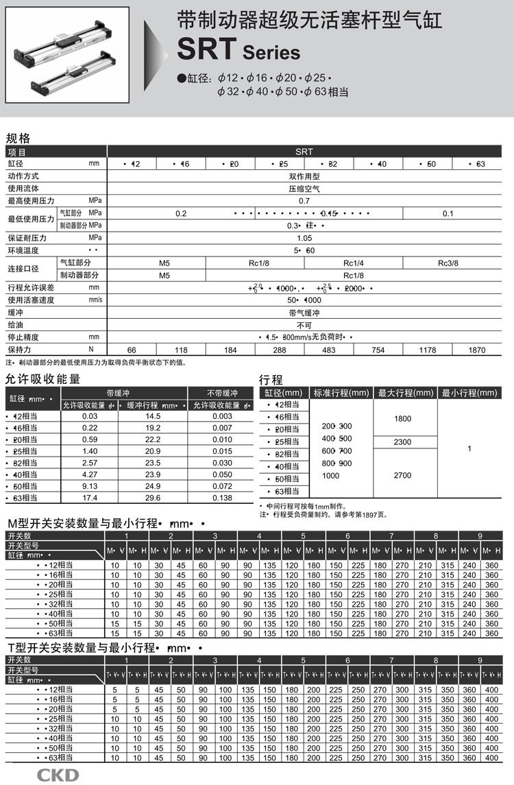 SRT-00-12B-200,SRT-LB-12B-200,SRT-LB-63B-700,SRT-00-63B-1000,CKD無活塞桿型氣缸