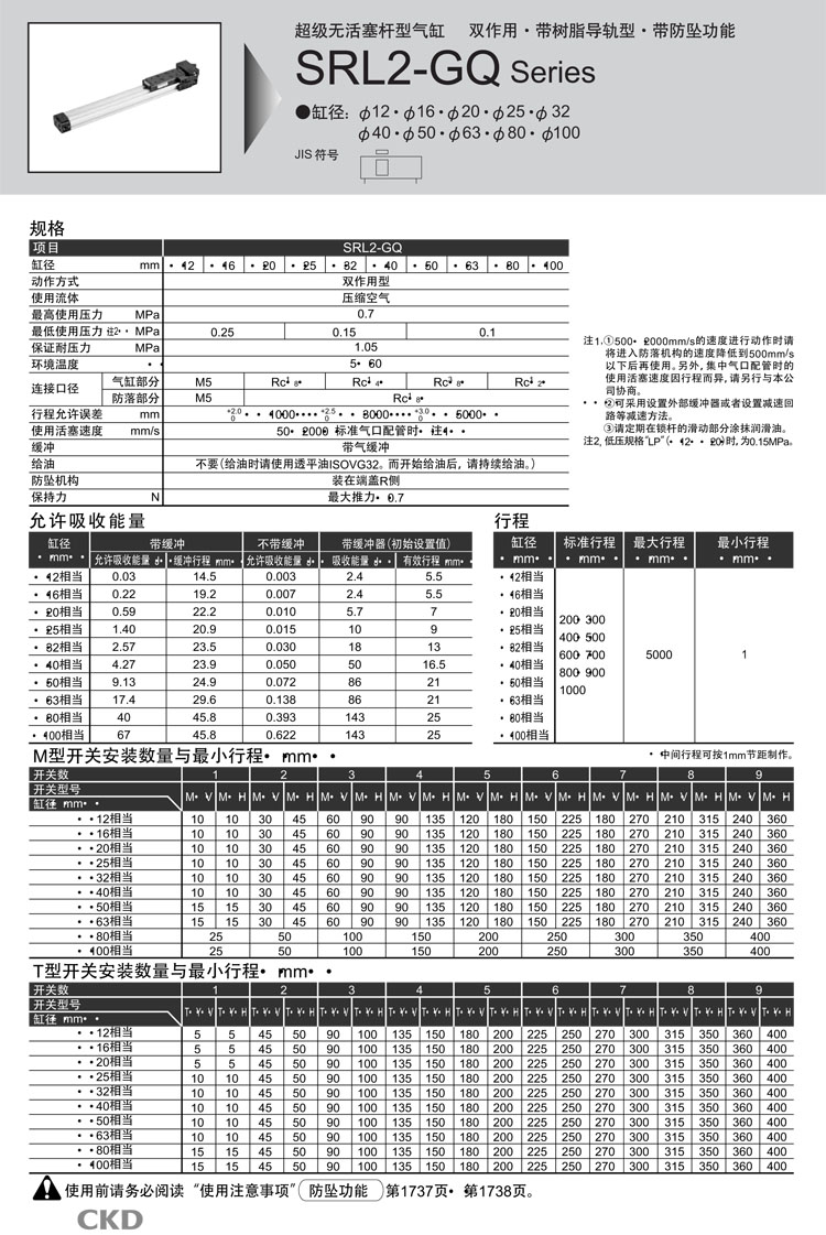 SRL2-GQ-LB1-25B-200,SRL2-GQ-LB1-25B-300,SRL2-GQ-LB1-25B-400,SRL2-GQ-LB1-25B-500,CKD超級無活塞桿型氣缸