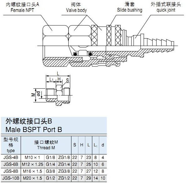 型號規(guī)格說明,下圖例JGS-W-6A(JGS-K-6B)插入式外螺紋接口。高性能快速接頭,外插式內(nèi)螺紋接口。