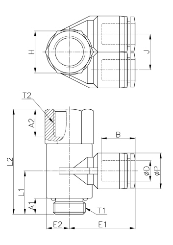 | Model | ∅D | ∅P | T1 | T2 | L1 | L2 | J | E1 | E2 | A1 | A2 | B | H(Hex) | ORIFICE | WEIGHT(g) | EA(BOX) |