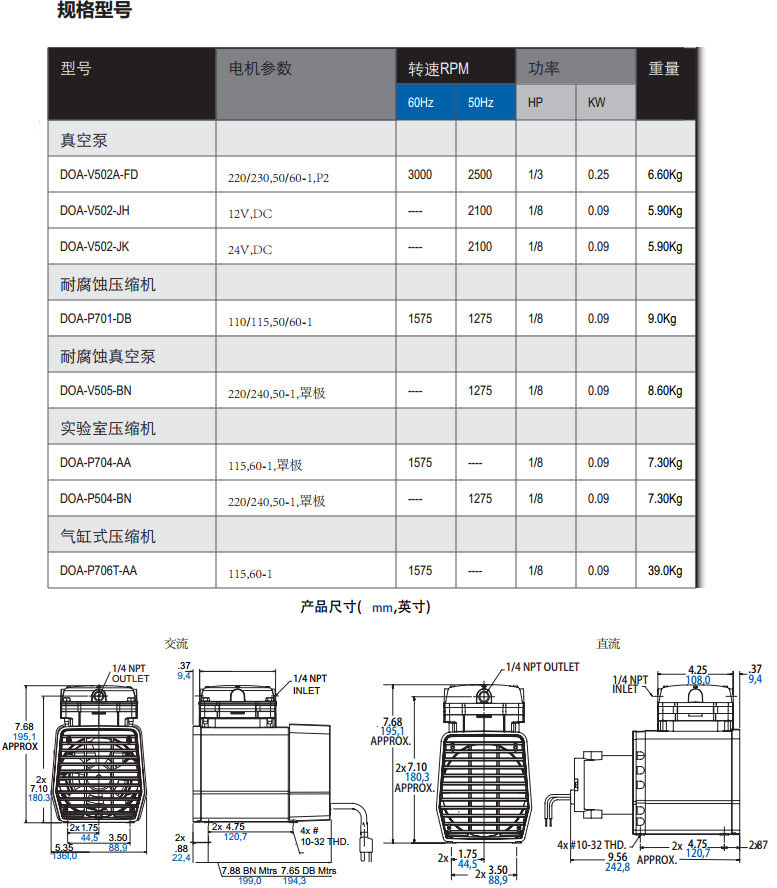 DOA-P701-AA,DOA-P703-AA,DOA-V722-AA,DOA-V702-AC,隔膜式真空泵/壓縮機
