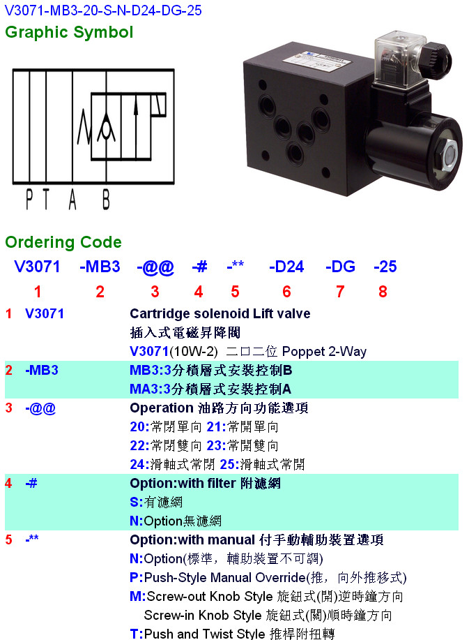 V3071-MA3-20,V3071-MA3-21,V3071-MA3-22,V3071-MB3-23,V3071-MB3-24,V3071-MB3-20-S-P-A22-DG-25,HYDROMAX插入式電磁升降閥