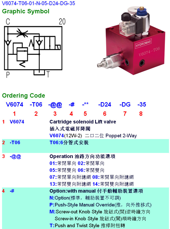 V6074-T06-02,V6074-T06-05,V6074-T06-06,V6074-T06-07,V6074-T06-01-N-05-D24-DG-35,HYDROMAX插入式電磁升降閥 |