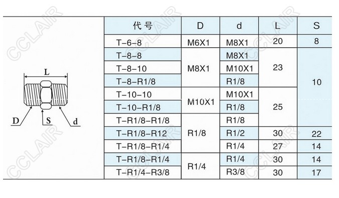 T-6-8,T-8-8,T-8-10,T-8-R1/8,T-10-10,T-10-R1/8,T-R1/8-R1/8,T-R1/4-R3/8