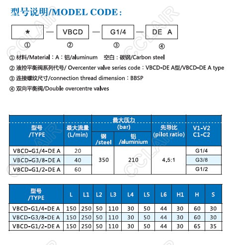 VBCD-G1/4-DEA,VBCD-G1/4-DE-A,VBCD-G3/8-DE-A,VBCD-G1/2-DE-A,VBCD-DE-A,雙向平衡閥