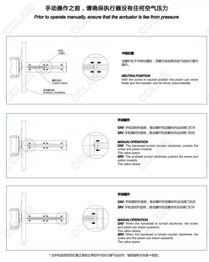 為了保證氣動(dòng)執(zhí)行器的正常工作,在對(duì)手動(dòng)應(yīng)急手動(dòng)執(zhí)行任何操作之前必須將氣動(dòng)執(zhí)行器的氣源斷開。