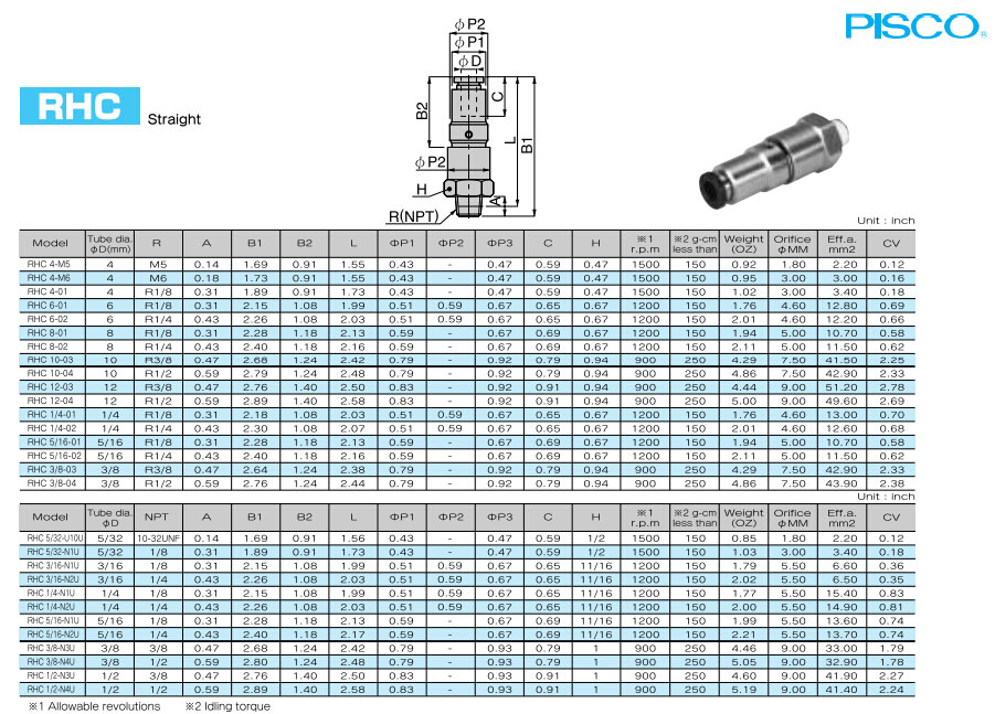 RHC4-M5,RHC6-01,RHC8-01,RHC10-03,RHC12-03,RHC1/4-01,RHC5/16-01,RHC3/8-03,PISCO高旋轉(zhuǎn)接頭