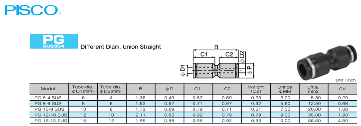 PG6-4SUS,PG8-6SUS,PG10-8SUS,PG12-10SUS,PG16-12SUS,PISCO快速接頭