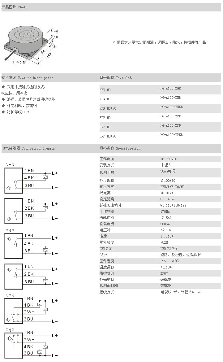 餅型接近傳感器 HG-A100-ZNK,HG-A100-ZNB,HG-A100-ZNKB,HG-A100-ZPK,HG-A100-ZPB,HG-A100-ZPKB,