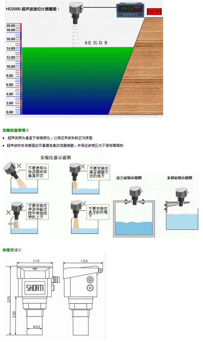 概述:HD2000超聲波液位計(jì)是一種先進(jìn)的非接觸式物位測(cè)量?jī)x器,用來取代原始的各種液位計(jì),直接安裝在被測(cè)介質(zhì)的上方。它采用一體式進(jìn)口超聲波傳感器,通過測(cè)量時(shí)間差的原理,經(jīng)微處理器進(jìn)行信號(hào)處理精密計(jì)算,測(cè)得液位/料位高低。帶自動(dòng)溫度補(bǔ)償、假信號(hào)回避功能,自動(dòng)增益控制,新型高防護(hù)外殼,智能液晶顯示并輸出標(biāo)準(zhǔn)信號(hào)4~20mA 或RS485、 上下限報(bào)警。
