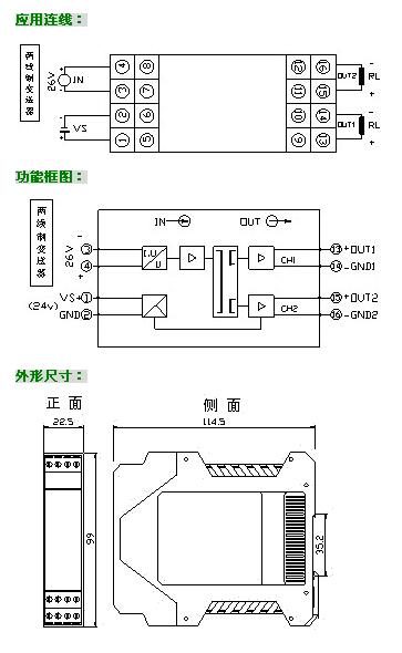 l 將1路4-20mA信號(hào)隔離分為2路信號(hào)輸出,并對(duì)現(xiàn)場(chǎng)二線制變