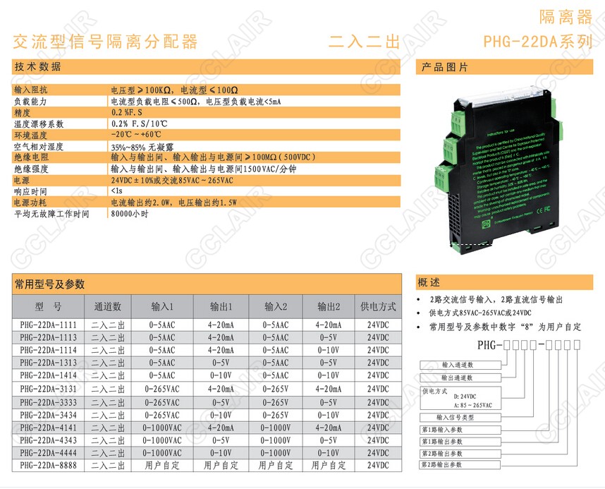 PHG-22DA-3434,PHG-22DA-4141,4343,PHG-22DA-4444,PHG-22DA-8888交流型信號隔離分配器